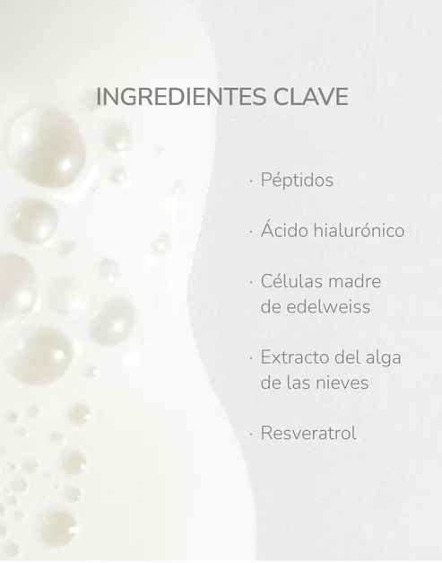 Serum de textura ligera y sedosa, formulado con un potente cóctel de Péptidos con efecto lifting y Resveratrol, que promueven la regeneración celular, aportando firmeza y reduciendo las líneas de expresión. Además contiene Células Madre de Edelweiss, que ofrece el doble de antioxidantes que la vitamina C, reduce las arrugas un -15% y aumenta la luminosidad un +325%.